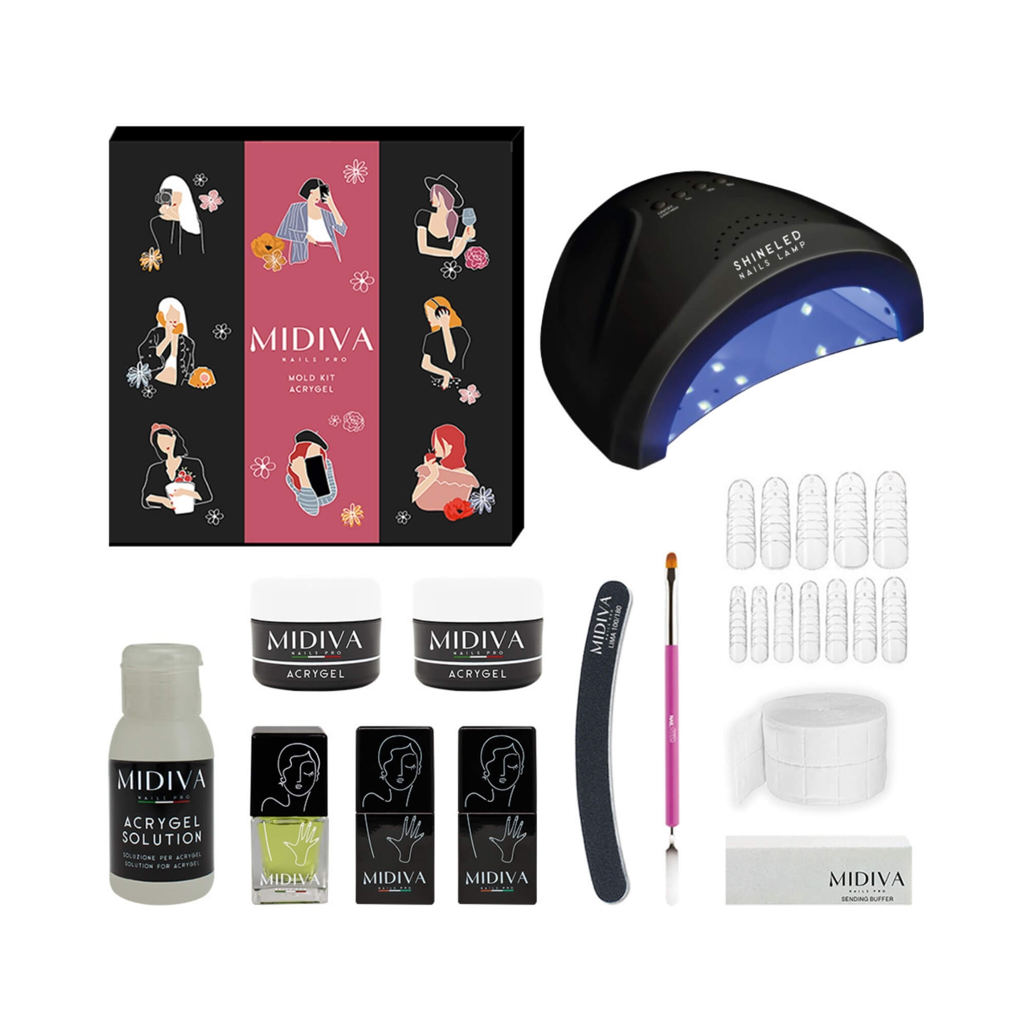MIDIVA® Nails Pro kit Acrygel, Set Completo Ricostruzione unghie "Mold" + Accessori, Made in Italy + Fornetto led 48W